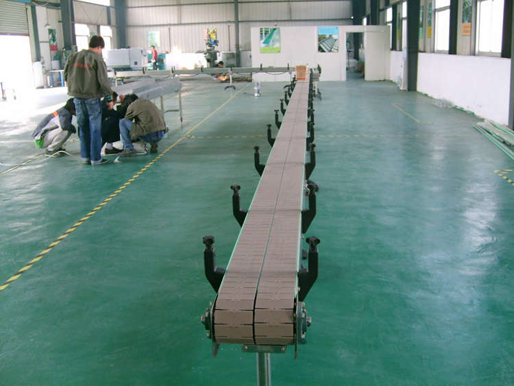 鏈板輸送機(jī)主用于各類飲料瓶裝的輸送,在飲料行業(yè)當(dāng)中其應(yīng)用非常廣泛,主要由各類鏈板進(jìn)行串接而成,所生產(chǎn)820塑鋼直線鏈板及821塑鋼直線鏈板和881不銹鋼轉(zhuǎn)彎板是銷售量最好的鏈板其中的幾種。利用這些不同型號(hào)的鏈板進(jìn)行相組合可以進(jìn)行滿足各類飲料的貼標(biāo)、灌裝、清先等輸送設(shè)備的單列輸送要求,同時(shí)也可以進(jìn)行多列并行走緩慢,從而產(chǎn)生儲(chǔ)存量,滿足于殺菌機(jī)、儲(chǔ)瓶臺(tái)、冷瓶機(jī)的大量供料要求。